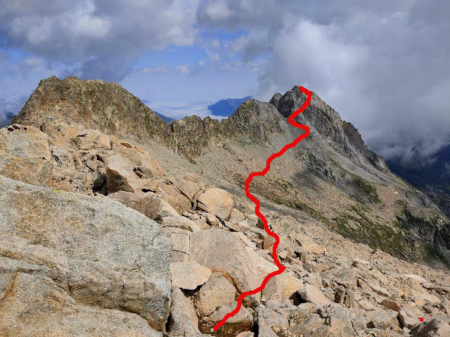 4 h 46 min Marcada bretxa encarada al precipici. Deixem els bastons i comencem a grimpar seguint les nombroses fites i el pas dels humanoides. No és una escalada difícil (PD+) que es pot fer sense corda, però cal parar compte. Hi ha parabolts per rapelar. Pensava que seria una roca molt trencada però crec que el pas d'excursionistes ha fet ja caure nombroses pedres.